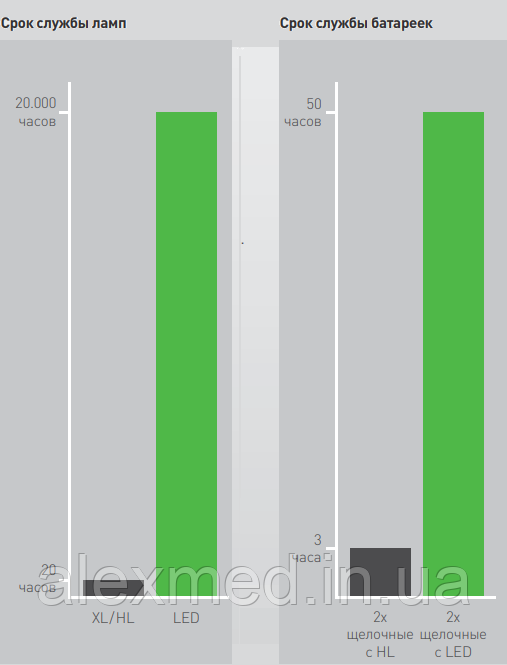 Світлодіодна техніка для отоскопов і офтальмоскопів з низкорефлектирующим, яскравим білим освітленням, подібним денного. Чисте світло денного спектру (прибл. 5.500 K) забезпечує оптимальне неискажающее освітлення, а також поліпшену колірну диференціацію, що дозволяє проводити більш ефективну діагностику у порівнянні з галогеновим або ксеноновим освітленням.